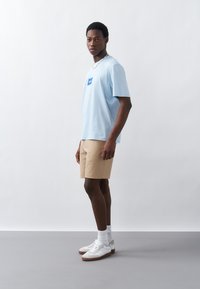Homme portant un short beige, une chemise bleu clair, des chaussettes blanches et des baskets blanches, debout sur un sol gris devant un fond uni.