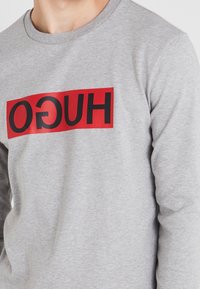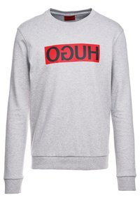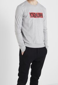 Pull gris à encolure ras du cou avec un logo "HUGO" audacieux en rouge et noir sur le devant ; associé à un pantalon noir.