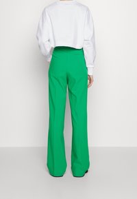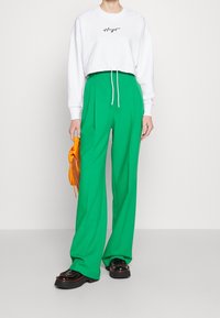 Personne portant un sweat-shirt court blanc avec le logo "Hugo" et un pantalon plissé taille haute vert vif, les mains relâchées le long du corps.
