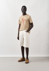 Homme à la peau foncée et aux dreadlocks portant un T-shirt beige avec un motif d'oiseau rouge et un pantalon blanc, appuyé légèrement contre un mur blanc.