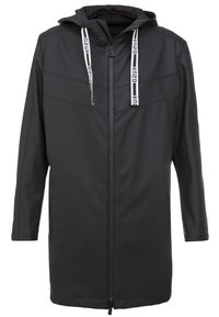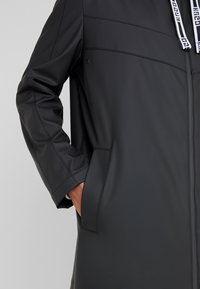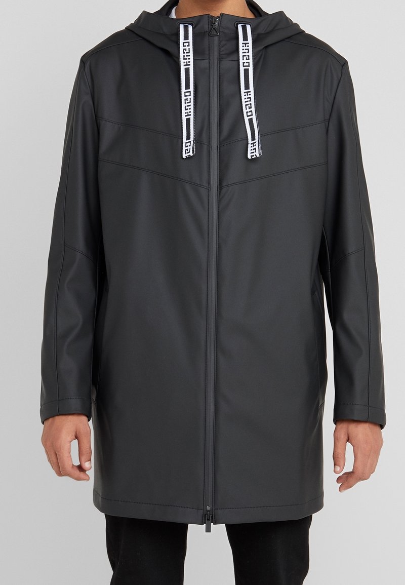 Veste noire à capuche en matériau lisse et imperméable. Comprend une fermeture éclair intégrale, des poches latérales et des cordons contrastants sur la capuche.