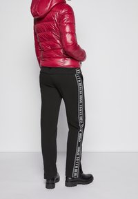 Personne appuyée contre un mur de briques blanc portant une doudoune rouge brillante, un haut noir zippé, un pantalon noir avec des bandes latérales et des bottes noires.