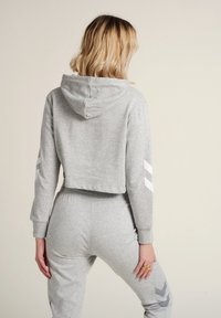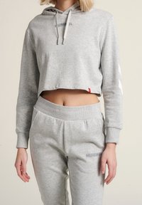 Haut en molleton gris avec capuche à cordon et logo sur le devant, associé à un pantalon de jogging assorti avec un logo et une taille élastique.
