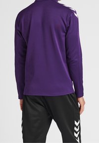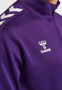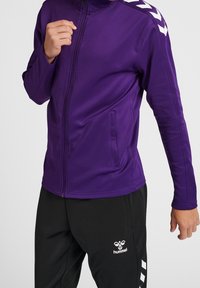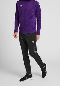 Personne portant une veste zippée violette et un pantalon de sport noir Hummel, avec la veste partiellement zippée et la main près du col.