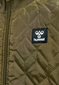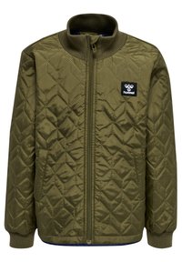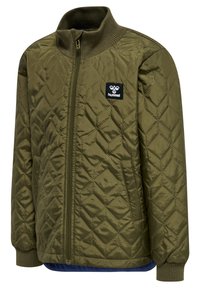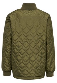 Veste matelassée verte olive avec un col haut, fermeture éclair à l'avant, deux poches latérales, poignets côtelés et un patch logo noir sur la poitrine gauche.