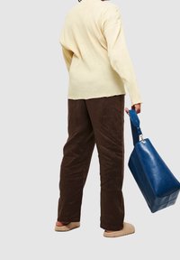 Personne portant un pull beige et un pantalon marron, tenant un grand sac à main en cuir bleu, et portant des chaussures ouvertes beiges.