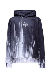 Sweat à capuche noir avec motif éclaboussures de peinture blanche, doté d'une poche avant et d'une capuche avec cordon de serrage. Le tissu présente une texture lisse. Logo sur la poitrine.
