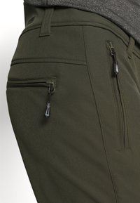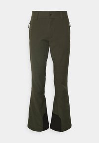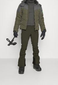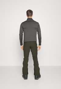 Haut noir à manches longues et pantalon de ski vert foncé en tissu extensible avec poches zippées, avec des accents de tissu noir aux poignets.