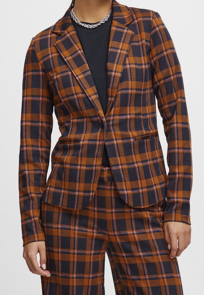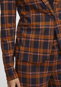 Femme portant un blazer à carreaux marron et bleu marine et un pantalon assorti sur un haut noir avec un collier chaîne argenté.