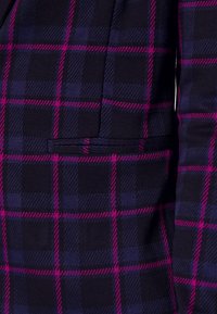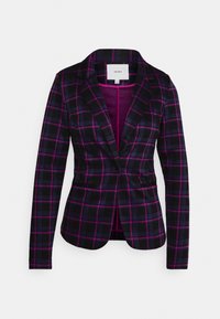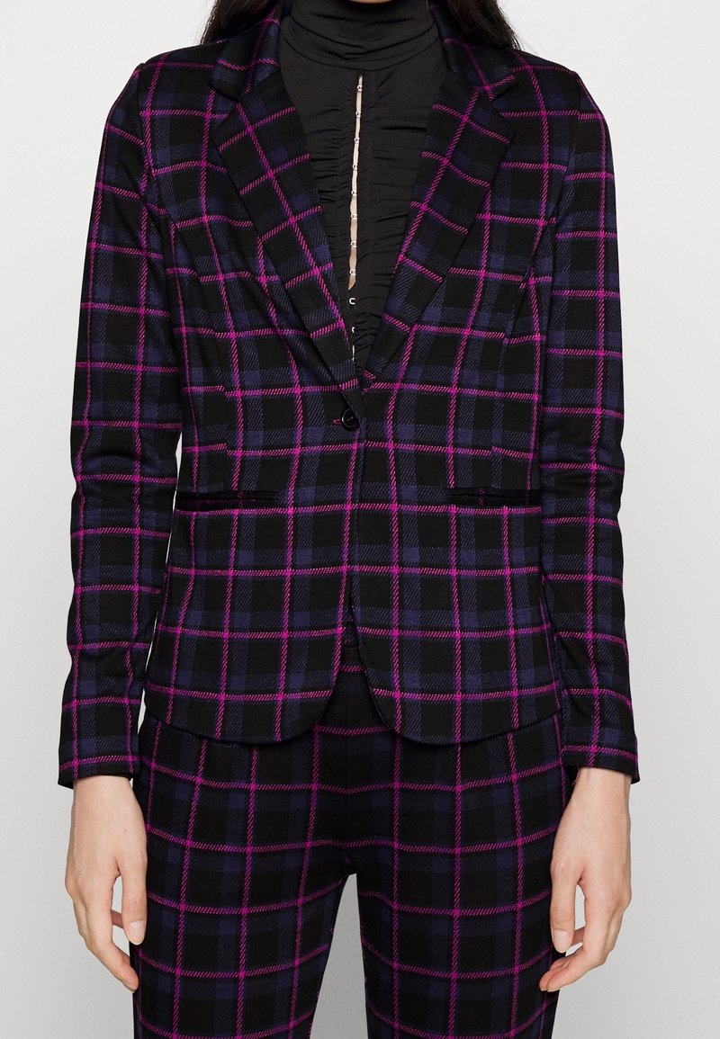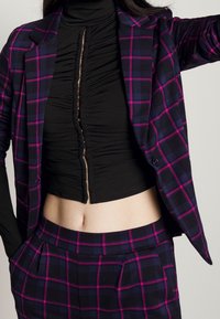 Femme portant un blazer à carreaux noir et violet assorti à un pantalon, sur un haut noir froncé avec un panneau central en tissu transparent.