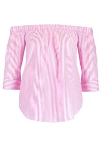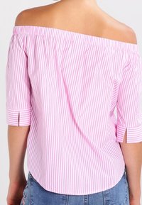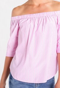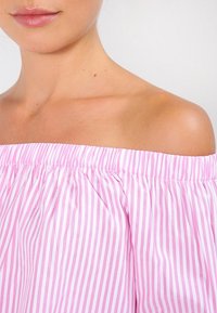 Femme portant un chemisier à rayures roses et blanches, épaules dénudées, manches trois-quarts, associé à un jean bleu.