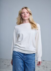 Pull crème clair avec encolure bateau et manches bouffantes, associé à un jean bleu taille haute ; texture lisse et coupe décontractée.