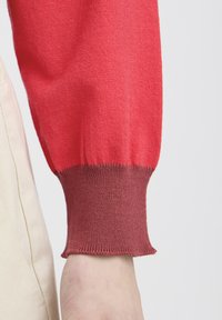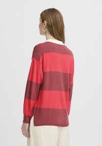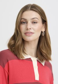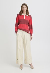 Femme aux cheveux mi-longs portant un polo à manches longues rayé rouge et rouge foncé, et un pantalon plissé taille haute couleur crème.