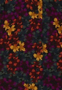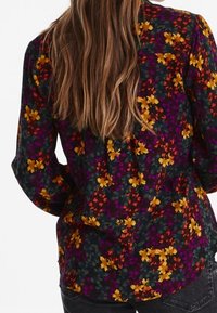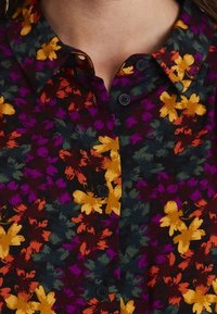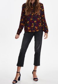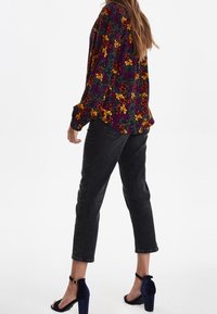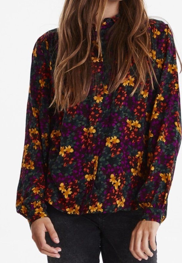 Femme portant une chemise noire à manches longues avec un imprimé floral jaune, orange et violet, associée à un jean foncé, debout les mains relâchées.