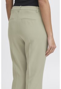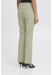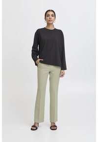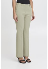 Femme portant un pantalon droit vert clair et des sandales à talons noires, debout devant un fond uni.