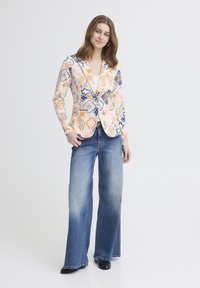 Femme portant un blazer crème avec des motifs floraux géométriques multicolores et un jean bleu, debout devant un fond clair.