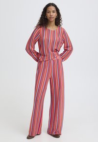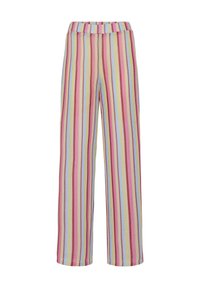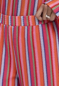 Personne portant un pantalon taille haute à jambes larges avec des rayures verticales multicolores, assorti à des chaussures marron à bouts pointus et un haut rayé assorti.