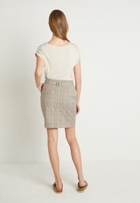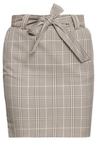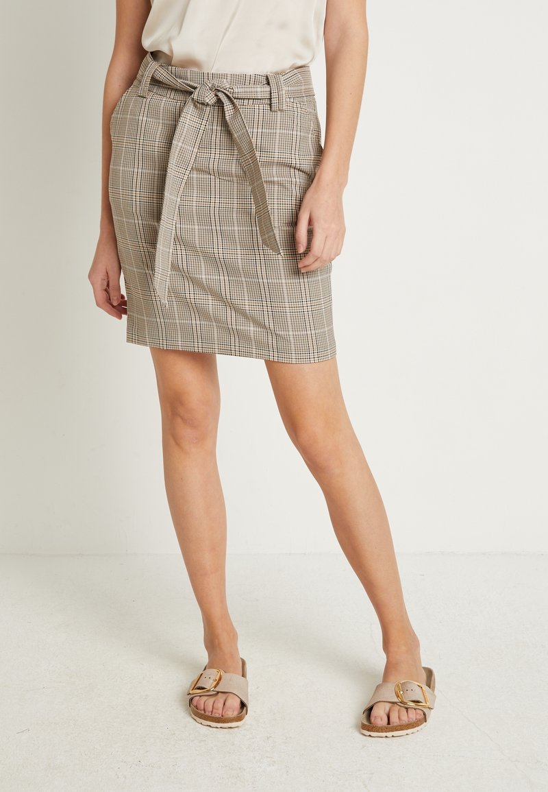 Femme portant une jupe beige à carreaux avec ceinture nouée, un haut blanc et des sandales beiges à glissière avec une grande boucle dorée, debout sur un sol clair.