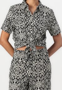 Pantalon large à motifs noir et blanc avec une taille à cordon, présentant un motif en losange. Associé à des mules à talons foncées et texturées.