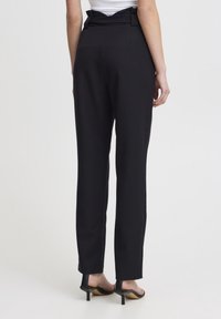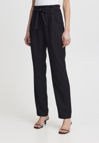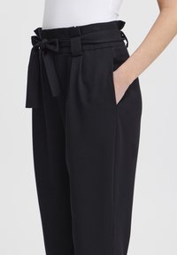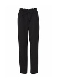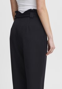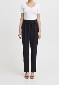 Pantalon noir taille haute avec ceinture à nouer, en tissu texturé et coupe fuselée. Porté avec des bottines noires.