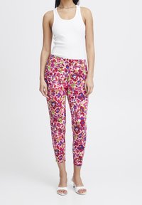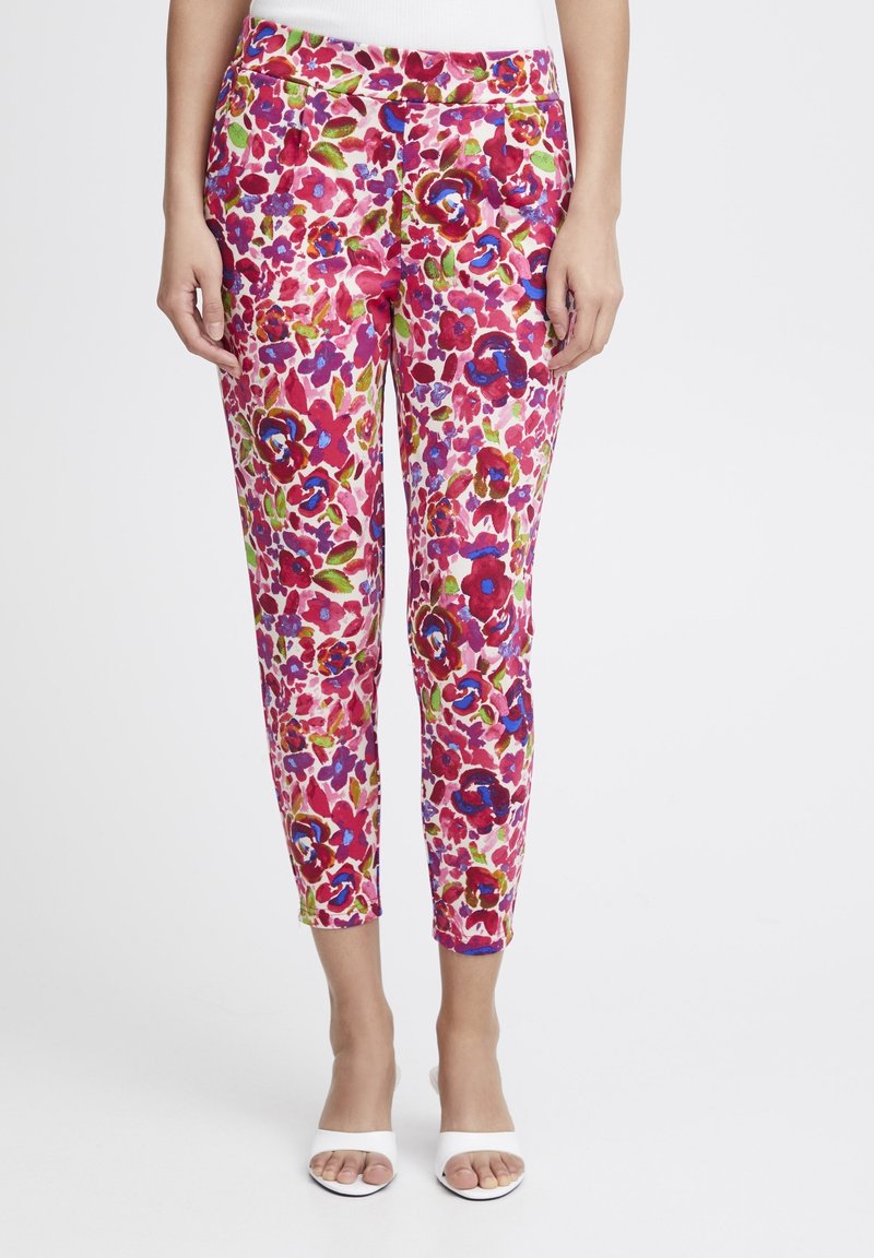 Pantalon coupe slim raccourci avec un motif floral vibrant en rouge, rose, bleu et vert, porté avec des talons ouverts blancs et un haut blanc.