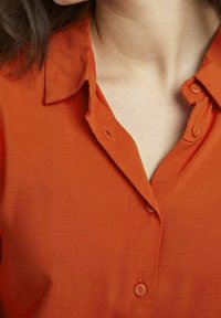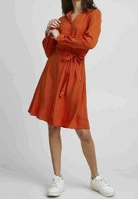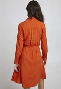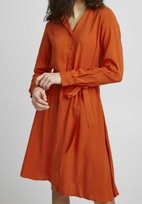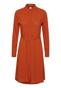 Robe orange rouille avec des manches longues, un devant à boutons et une taille nouée. Tissu lisse, forme A-line et détail de fente sur le côté.