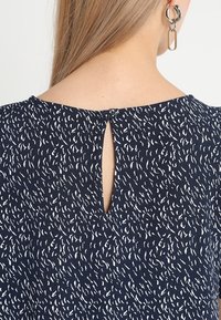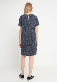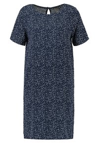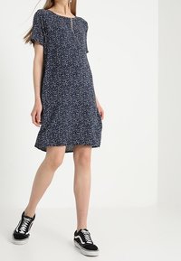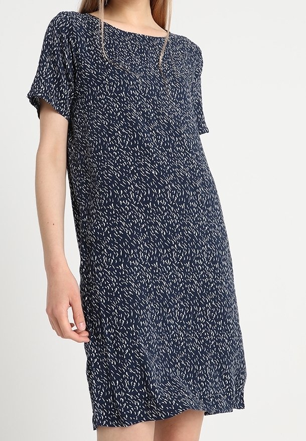 Robe navy à manches courtes avec un motif blanc dispersé, fabriquée en tissu léger, dotée d'une coupe décontractée et d'un col rond.