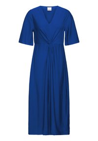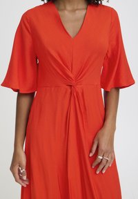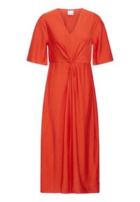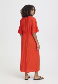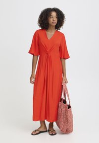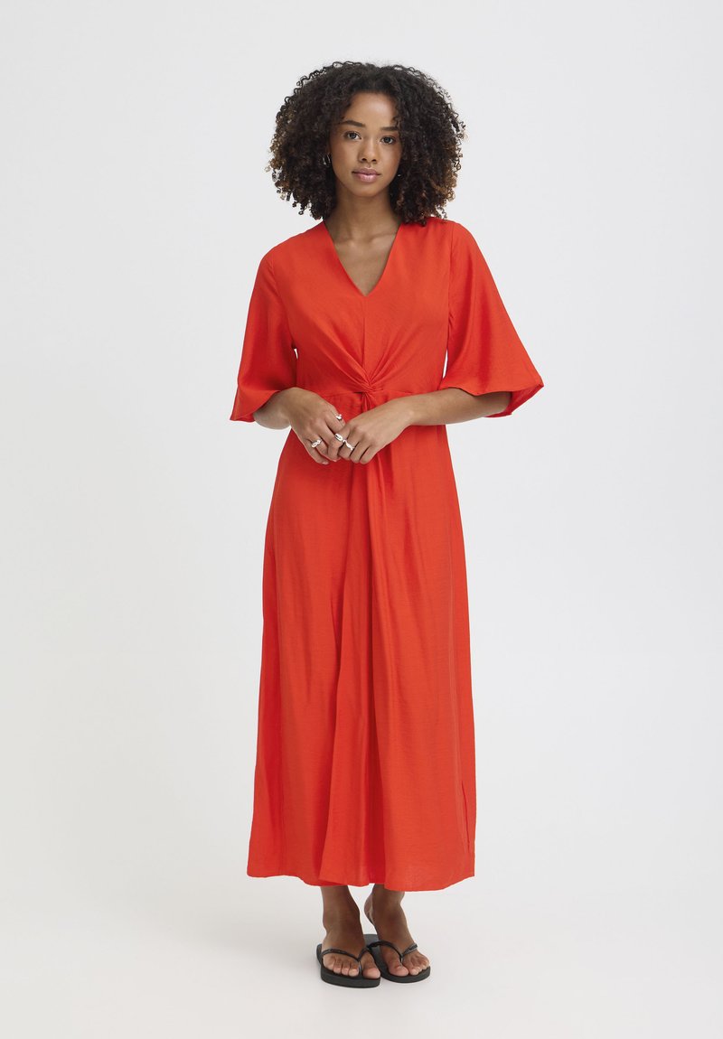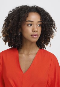 Femme aux cheveux bouclés portant une longue robe rouge à manches trois-quarts et des sandales noires, debout devant un fond blanc uni.