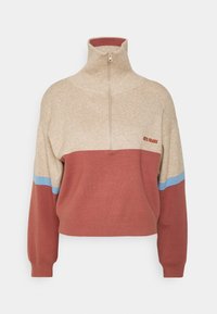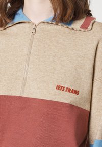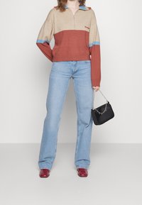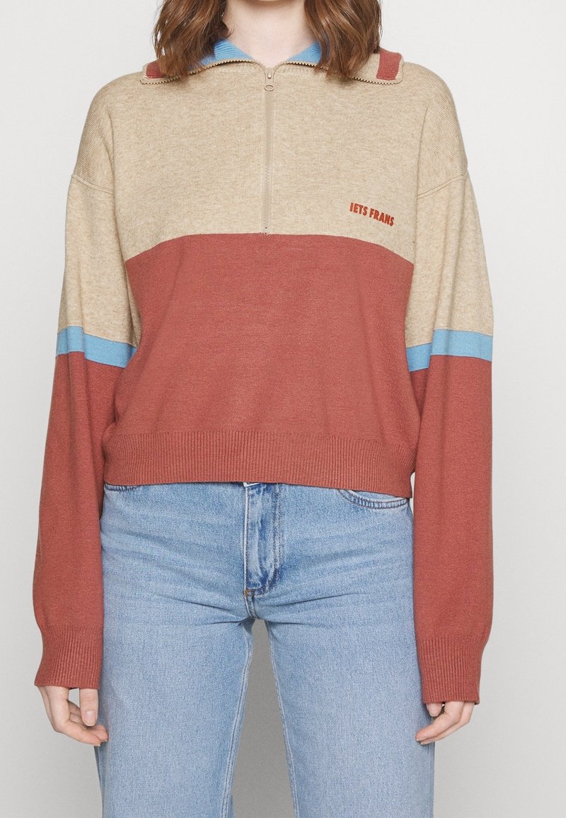 Jeune femme portant un pull beige et rouille à blocs de couleurs avec une bande bleue et un jean bleu clair, debout devant un fond uni.