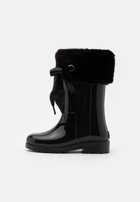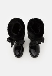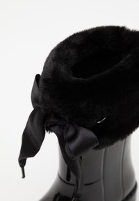 Botte de pluie noire brillante avec col en fausse fourrure, lacet en ruban et accents de coton. Matériau en caoutchouc, semelle plate, design mi-mollet.