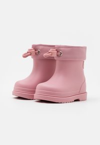 Botte de pluie en caoutchouc rose avec manchette ajustable et cordon de serrage, semelle plate et logo "igor" sur le côté, présentée en profil contre un fond blanc.