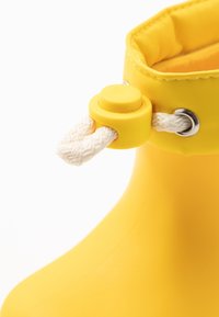 Bottes de pluie en caoutchouc jaunes avec des semelles blanches. La botte gauche présente un bord matelassé et un système de fermeture à cordon, ajoutant texture et détails.