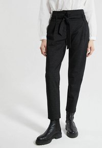 Pantalon noir taille haute avec ceinture à nouer, en tissu texturé et coupe fuselée. Porté avec des bottines noires.