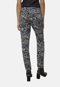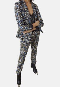 Pantalon imprimé floral en nuances de noir, crème et bleu, présentant une coupe ajustée avec des jambes effilées, porté avec des bottines à plateforme.