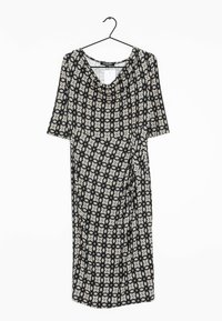 Robe noire mi-longue avec motif floral blanc, manches courtes et encolure drapée, suspendue sur un cintre noir contre un fond blanc.
