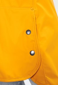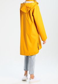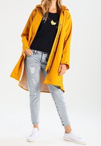 Femme portant un imperméable à capuche jaune vif avec boutons-pression, fermeture éclair, et un jean bleu clair déchiré, sur un fond uni.