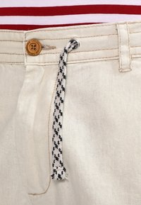 Pantalon en coton beige clair à coupe décontractée, doté d'un cordon de serrage à motif noir et blanc, et d'un unique bouton en bois à la taille.