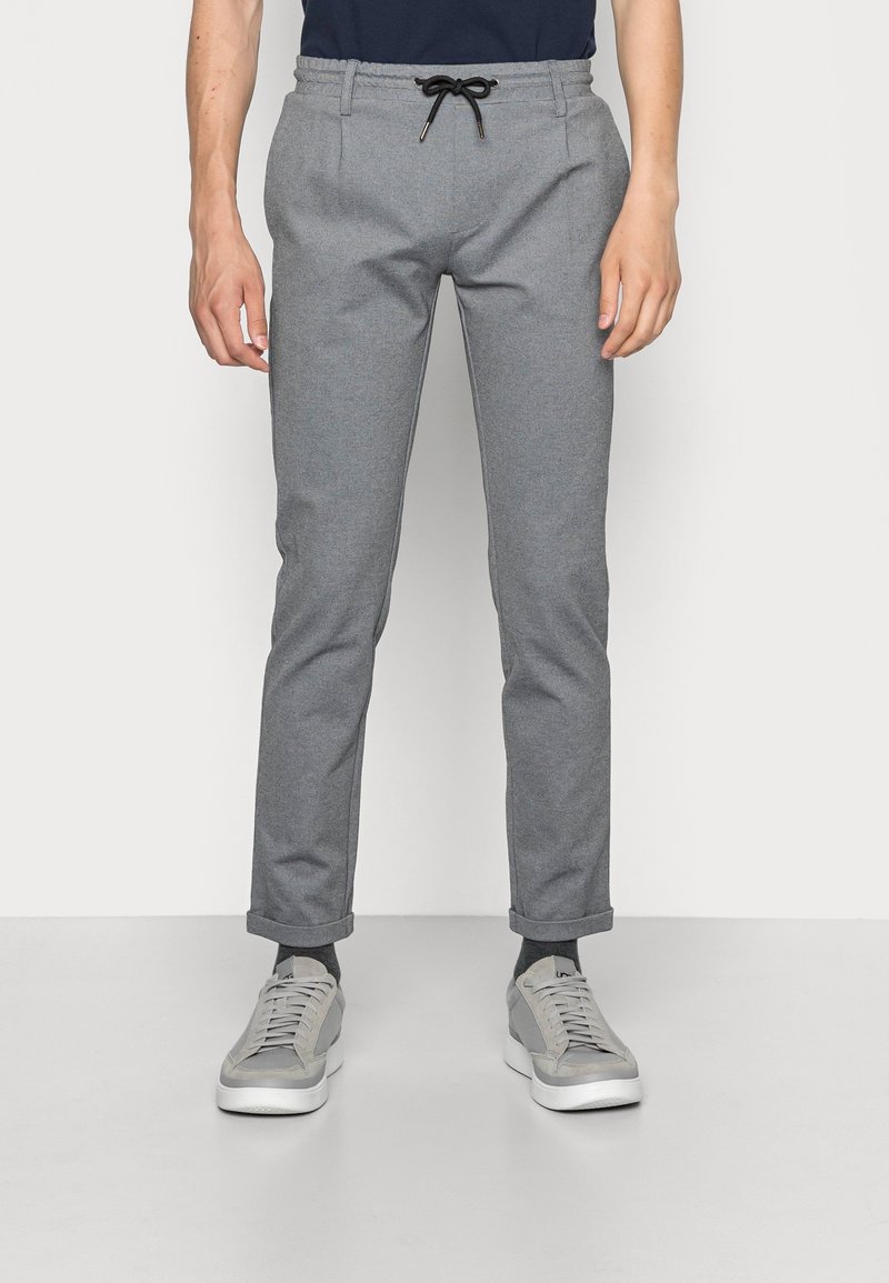 Homme portant un pantalon gris ajusté avec un cordon noir et des revers retroussés, associé à des baskets grises et des chaussettes foncées, debout devant un fond blanc.