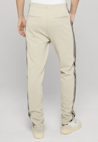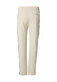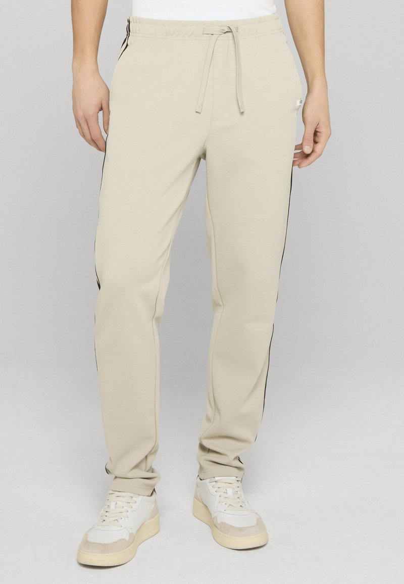 Pantalon de survêtement beige clair avec bandes latérales noires, taille élastique et cordon de serrage. Tissu en mélange de coton à texture lisse.