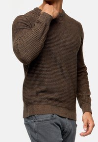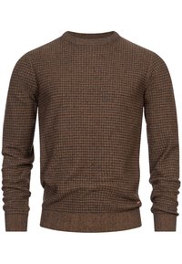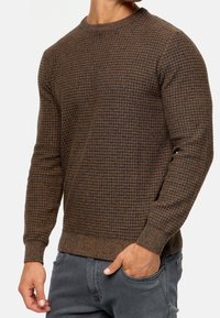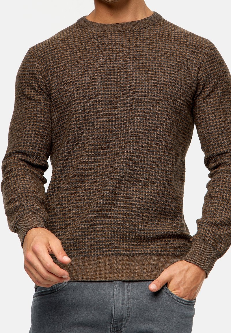 Homme portant un pull à manches longues à carreaux marron et noir et un jean gris, une main dans la poche et l'autre près de la taille.