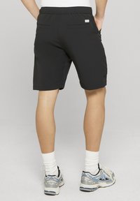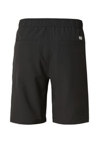 Shorts cargo noirs en tissu respirant, avec une ceinture élastique, une ceinture ajustable et plusieurs poches zippées à l'avant et sur les côtés.