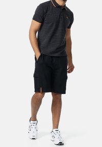 Shorts cargo noirs en coton, dotés d'une ceinture à cordon de serrage, de poches latérales et d'une coupe décontractée. Portés avec des chaussures de sport blanches.