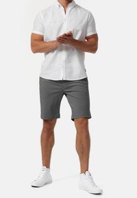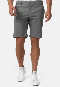 Shorts gris à rayures avec une coupe ajustée, dotés d'une fermeture à bouton et de poches, associés à des baskets blanches. Texture de tissu lisse.