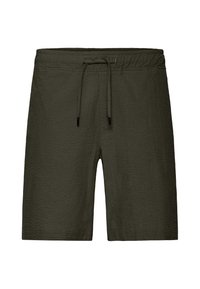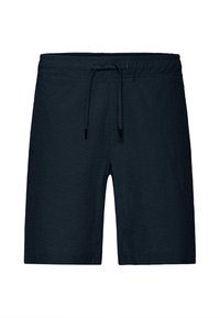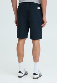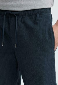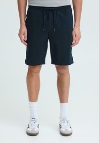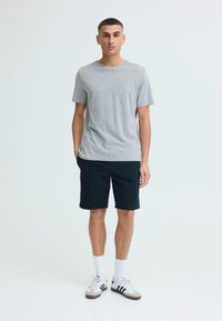Homme portant un short à cordon de serrage noir texturé, des chaussettes blanches et des baskets blanches à rayures noires, debout devant un fond uni.