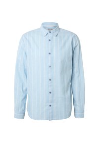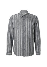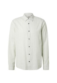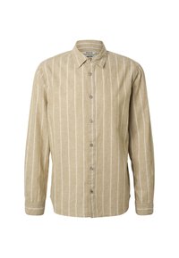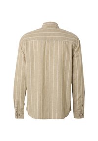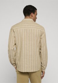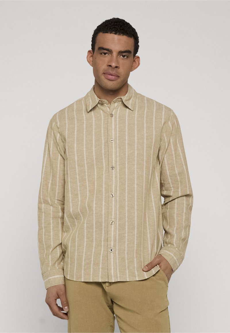 Homme portant une chemise beige à boutons avec des rayures verticales blanches et un pantalon marron clair, debout avec une main dans la poche devant un fond uni.