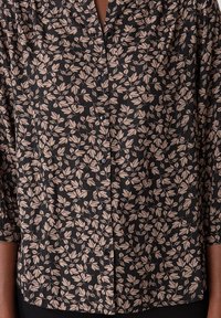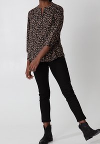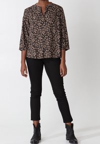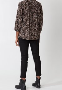 Personne portant un chemisier à manches longues noir à motifs floraux, un pantalon slim noir et des bottines noires, debout devant un fond clair uni.