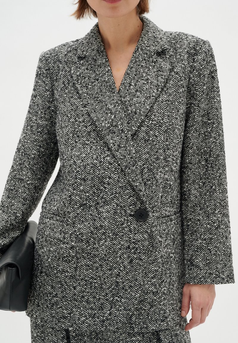 Femme portant un blazer à motif chevrons noir et blanc avec de larges revers, un seul bouton, et tenant une pochette noire.