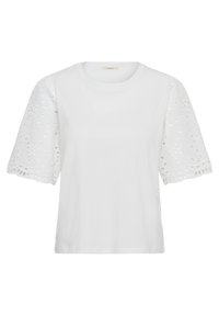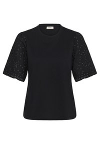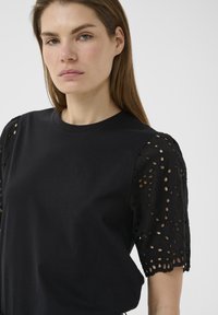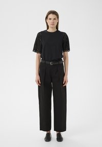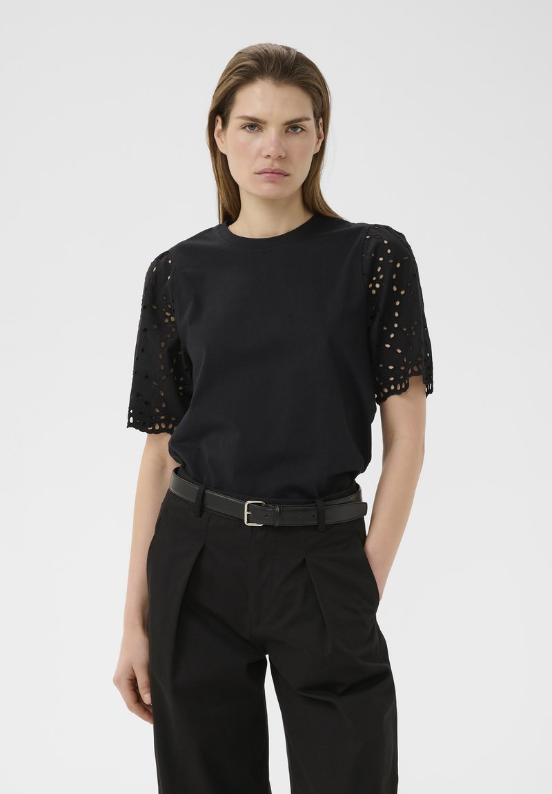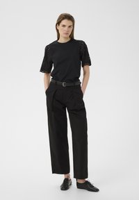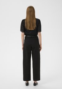 Femme aux cheveux bruns raides portant un chemisier noir à manches courtes en dentelle, pantalon noir ceinturé, debout devant un fond clair uni.