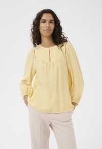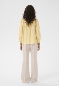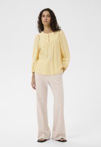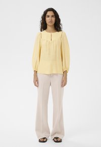 Femme aux cheveux bouclés portant un chemisier à manches longues jaune clair avec de petites découpes aux épaules et un pantalon beige clair, mains dans les poches.