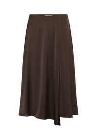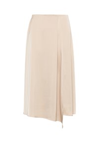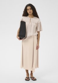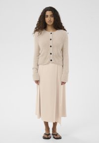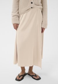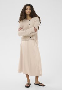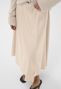 Personne portant un haut beige à manches longues en tissu pelucheux, une jupe midi beige clair fendue sur le côté, et des sandales tongs noires à bout carré, debout devant un fond blanc.
